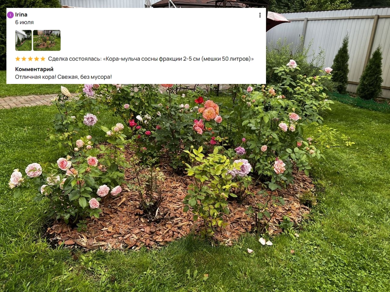 Применение: Подходит для мульчирования клумб, газонов, плодовых и декоративных деревьев. Также применяется для поддержания влажности и температуры почвы, предотвращая рост сорняков.