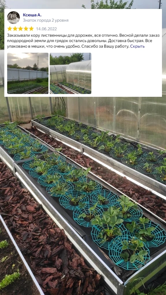 Применение: Используется для мульчирования больших площадей, включая газоны, аллеи и декоративные рабатки. Помогает снизить испарение воды, улучшает структуру почвы и укрепляет корневую систему растений.